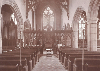 We believe that this photo must be pre-1910 because only the old pulpit is present. The reredos we have today is not in place and the old east window can be viewed easily. The design echoes the small window south of the altar. There is no electricity (for either organ or sound equipment) and there are more pews in view. The Lady Chapel also looks very different to today. (Facebook)